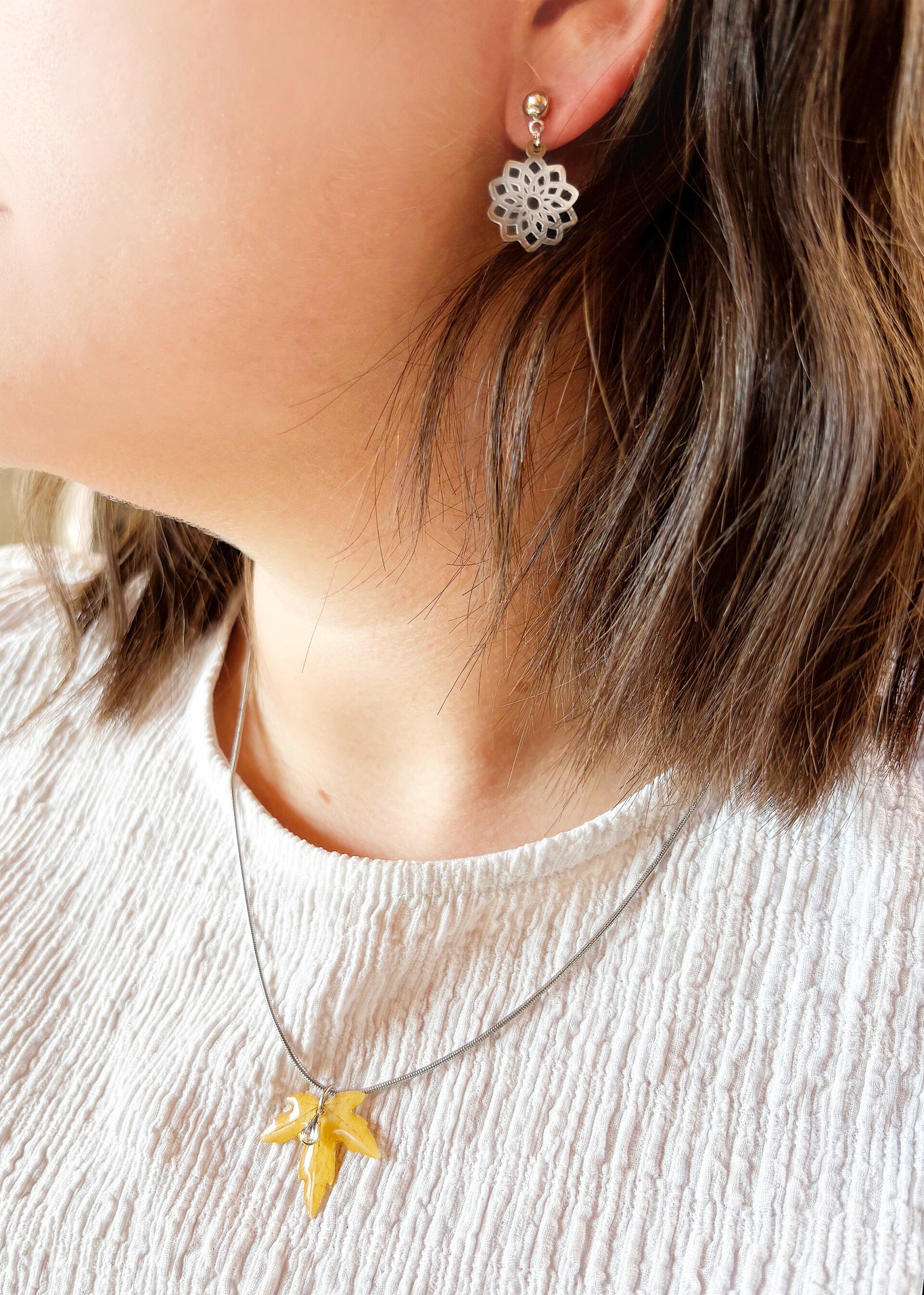 Un bel ensemble de boucles d'oreilles et collier, élaboré à partir d'une véritable feuille séchée d'automne.