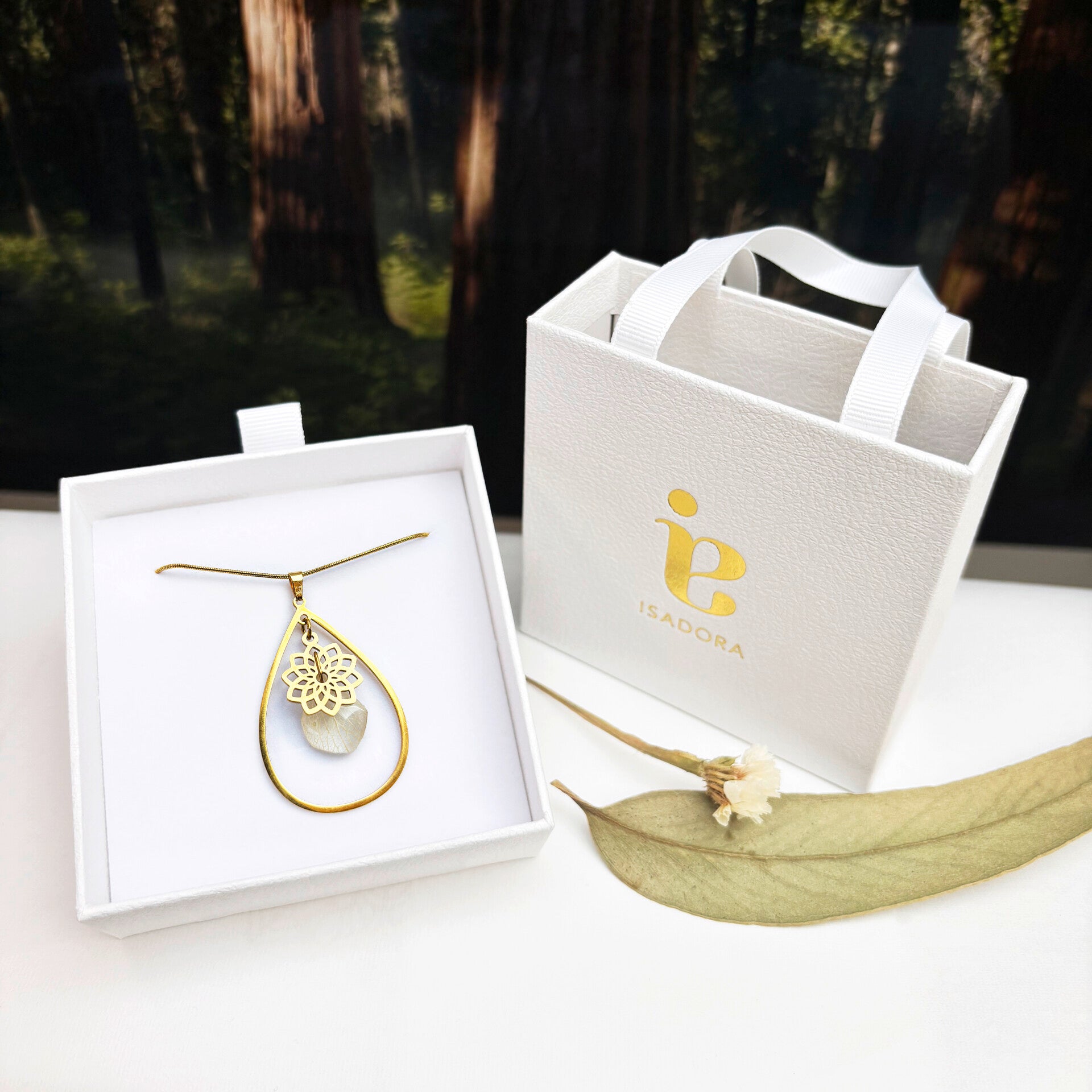 Un pendentif délicat élaboré à partir d'un véritable pétale (hortensia) dans les tons blanc.