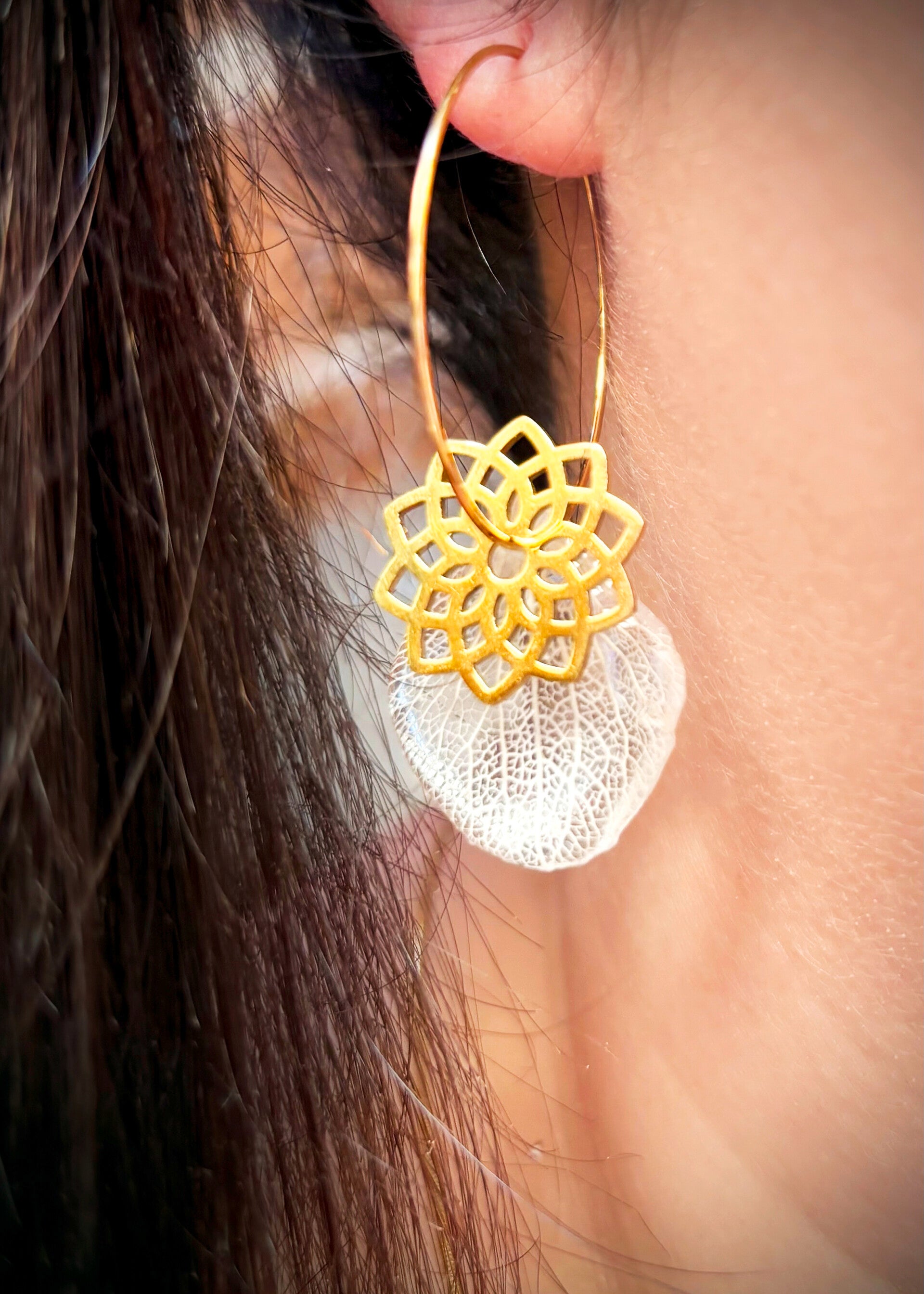 De jolies créoles réalisées à partir de véritables pétales de fleurs d'hortensia.