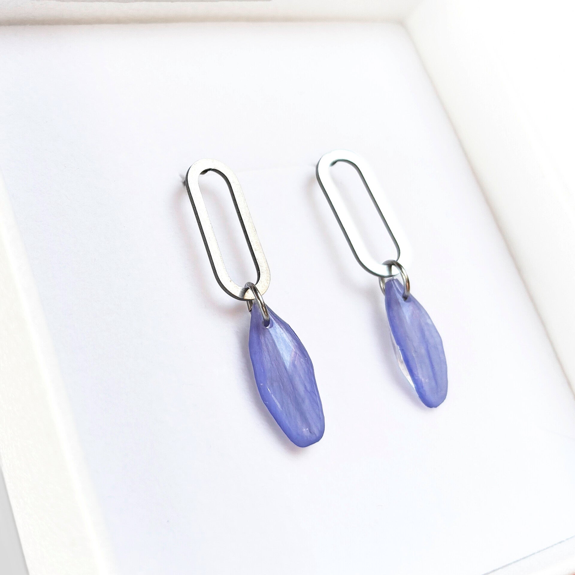 Des boucles d'oreilles uniques réalisées à partir de véritables pétales de fleurs (hepatica) dans les tons bleu/violet.